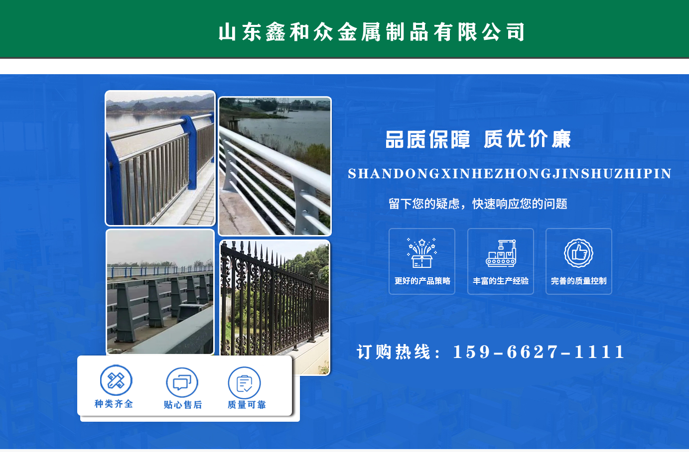 山東鑫和眾金屬制品有限公司主要產(chǎn)品有防撞護欄,橋梁護欄,道路護欄,河道護欄,不銹鋼護欄等護欄。提供設計方案,一站式定制,包您滿意價格優(yōu)惠,歡迎來電咨詢! 公司常年從事銷售護欄防撞護欄,橋梁護欄,道路護欄,河道護欄,不銹鋼護欄,橋梁鋼護欄,河道燈光護欄等。產(chǎn)品廣泛應用于橋梁、河道、旅游景區(qū)、道路、公路、公園、小區(qū)、景觀、道路防撞等領域?! 」井a(chǎn)品均采用優(yōu)質不銹鋼材料,符合相關標準。各種型號不銹鋼復合管及護欄,質量嚴格把控。產(chǎn)品強度高、耐腐蝕、焊接牢固、抗沖擊、性能好,防撞護欄結構簡單、美觀實用大方?! g迎前來訂購!...